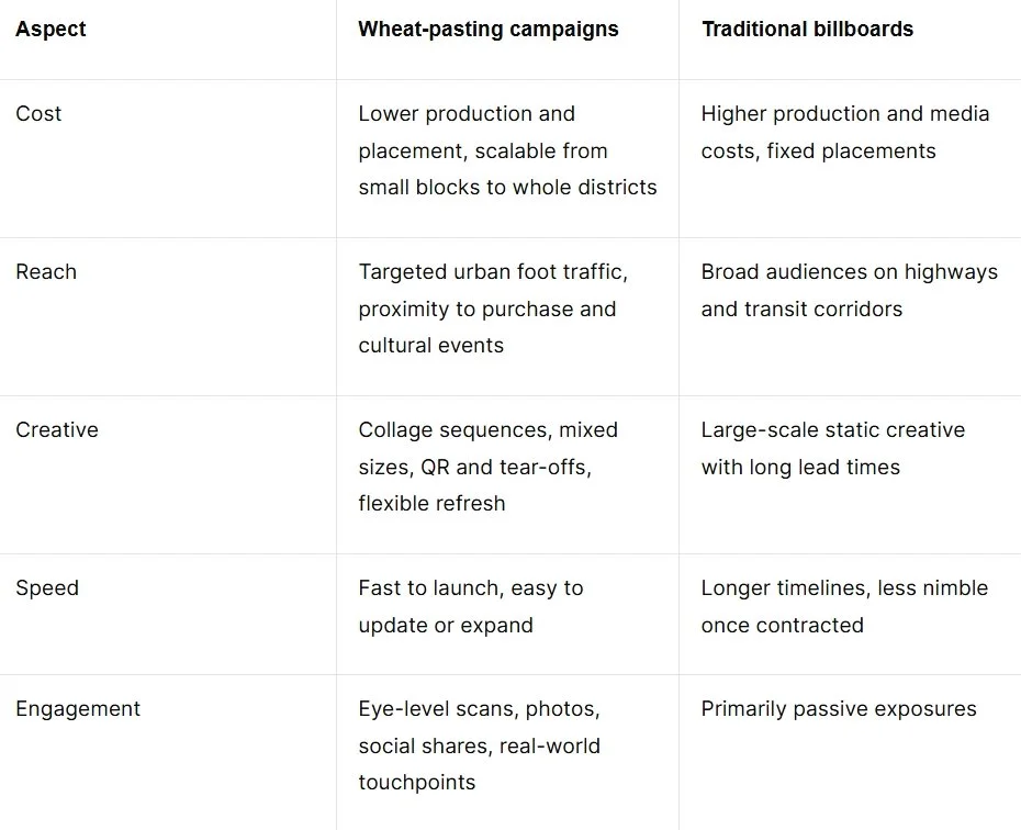 This chart contrasts wheat-pasting campaigns with traditional billboards. Wheat-pasting offers lower production costs, targeted urban reach, flexible creative formats such as collage sequences and QR tear-offs, and fast-to-launch adaptability with high engagement through photos, scans, and social shares. Traditional billboards, by contrast, have higher production costs, broad transit reach, static large-scale creative with long timelines, and primarily passive exposure.